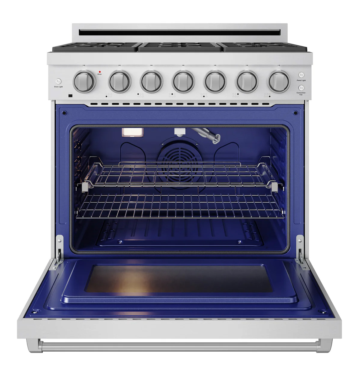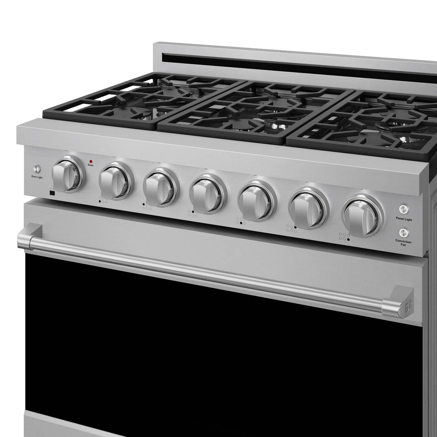 Porcelain drip pan Heavy duty cast iron cooking grates Stainless steel back riser. Optional island trim accessory for low profile back riser is available. Seven high quality Black ABS Control Knobs Stainless Steel commercial-style Control panel Convection Oven